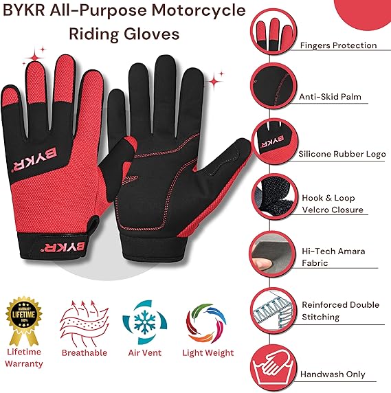- PARAMOUNT PROTECTION - Engineered with BYKR silicon printing on knuckles with ammara, added ammara double reinforced double stitched palm for unparalleled hand safety during motorcycle and other adventure outdoor sports. Ride confidently knowing your hands are fully protected from impacts and abrasions.