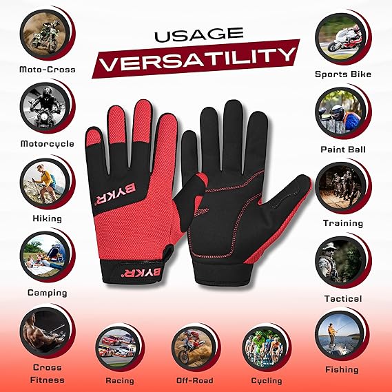 - SUPREME VERSATILITY: BYKR motocross gloves are all purpose and can be used for all types of outdoor adventure sports such as dirt bike gloves, mechanic gloves, dual sport gloves, atv gloves, motorcycle riding gloves, motocross gloves, tactical gloves, cycling gloves, MTB gloves, ski gloves & also as car driving gloves.